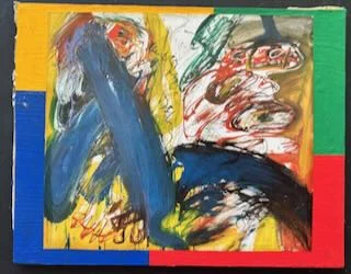 Bruno Dunst (1940–2023), HAPP – Abstrakte Komposition mit collagierten Drucken, Öl/Collage auf Platte.