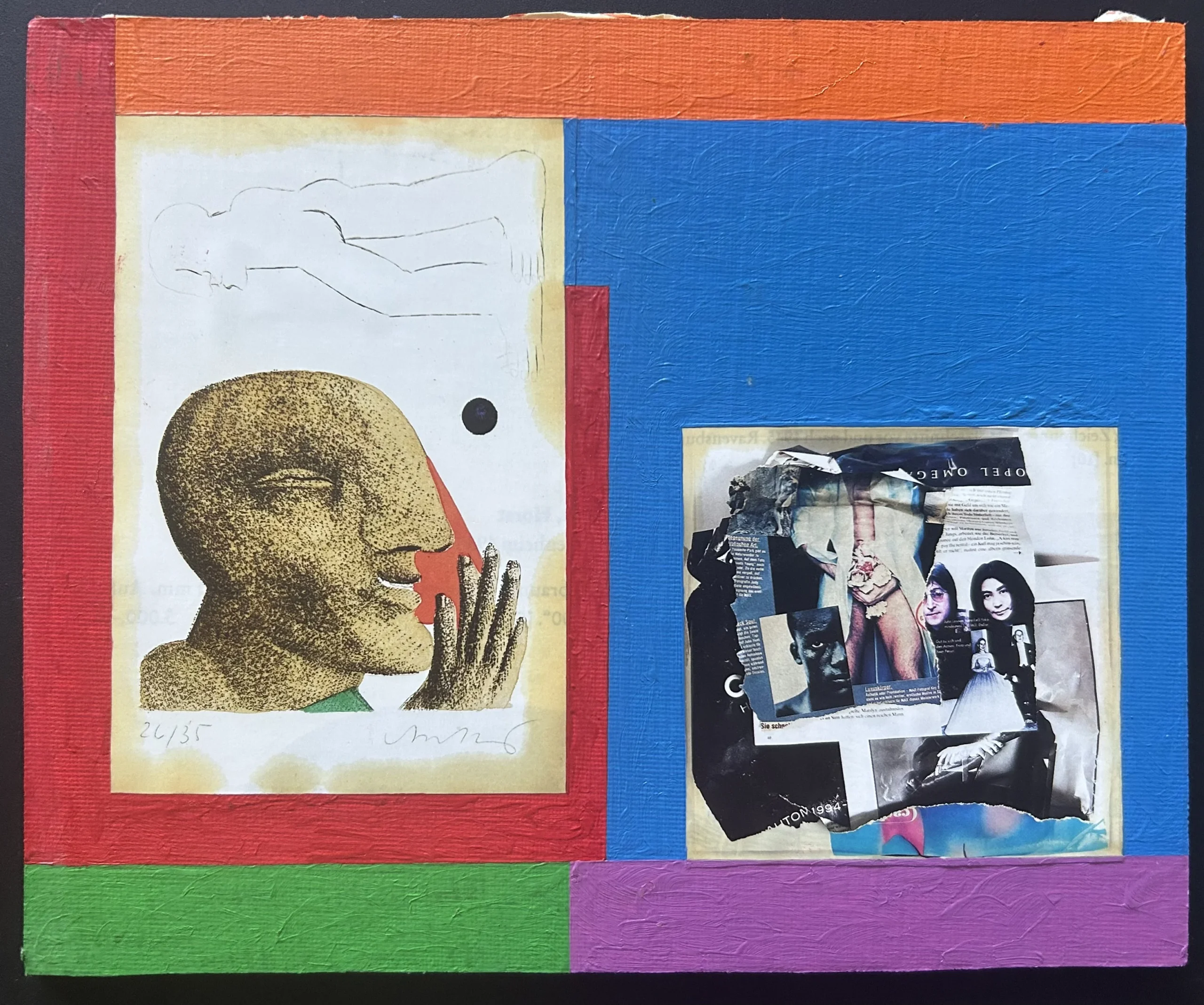 Bruno Dunst (1940–2023), HAPP – Abstrakte Komposition mit collagierten Drucken, Öl/Collage auf Platte.